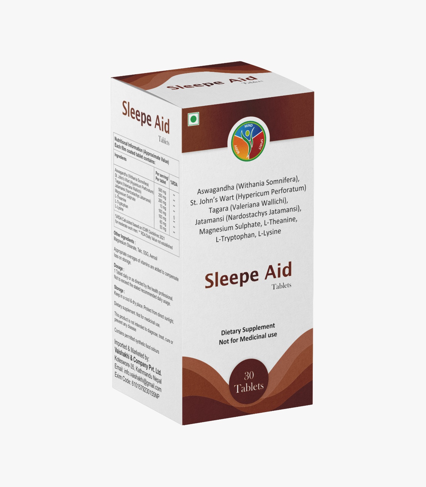 Sleepe Aid Tablets (30 Tablets) is a powerful blend of natural herbs and amino acids like Ashwagandha, St. John’s Wort, Tagara, Jatamansi, L-Theanine, L-Tryptophan, L-Lysine, and Magnesium Sulphate. Designed to support deep, restful sleep, reduce stress, and promote mental calmness naturally.