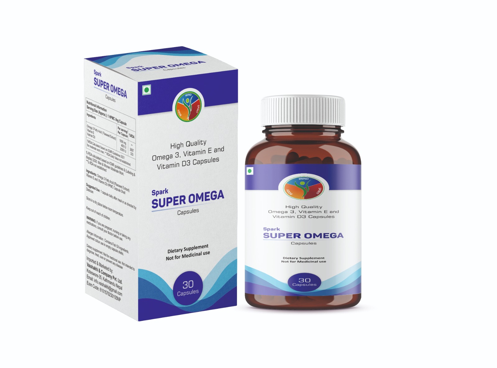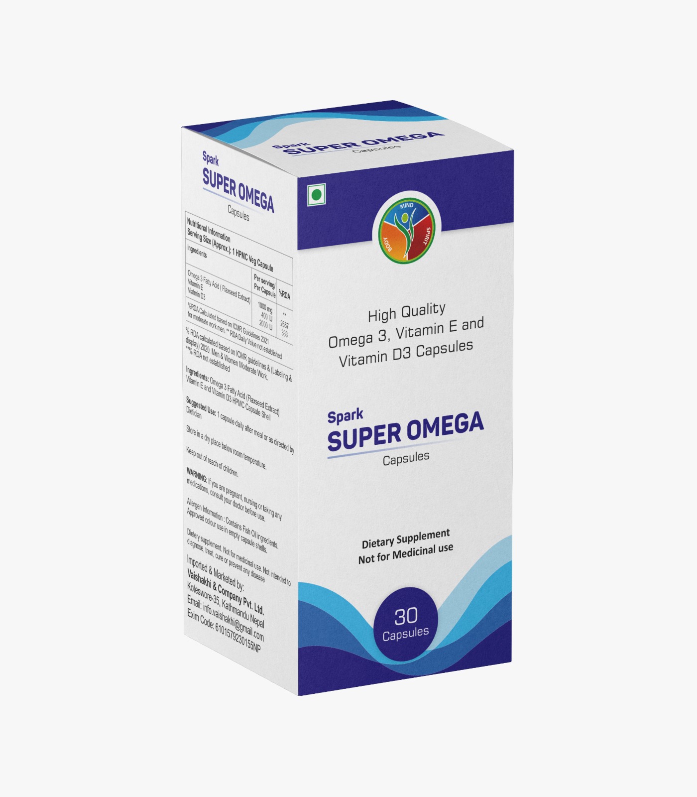 Super Omega Capsule delivers 1000mg of Omega-3 fatty acids (EPA 360mg & DHA 240mg) in a plant-based capsule. Enhanced with Vitamin E (400 IU) and Vitamin D3 (2000 IU), it promotes heart, brain, and joint health without any fishy aftertaste.
